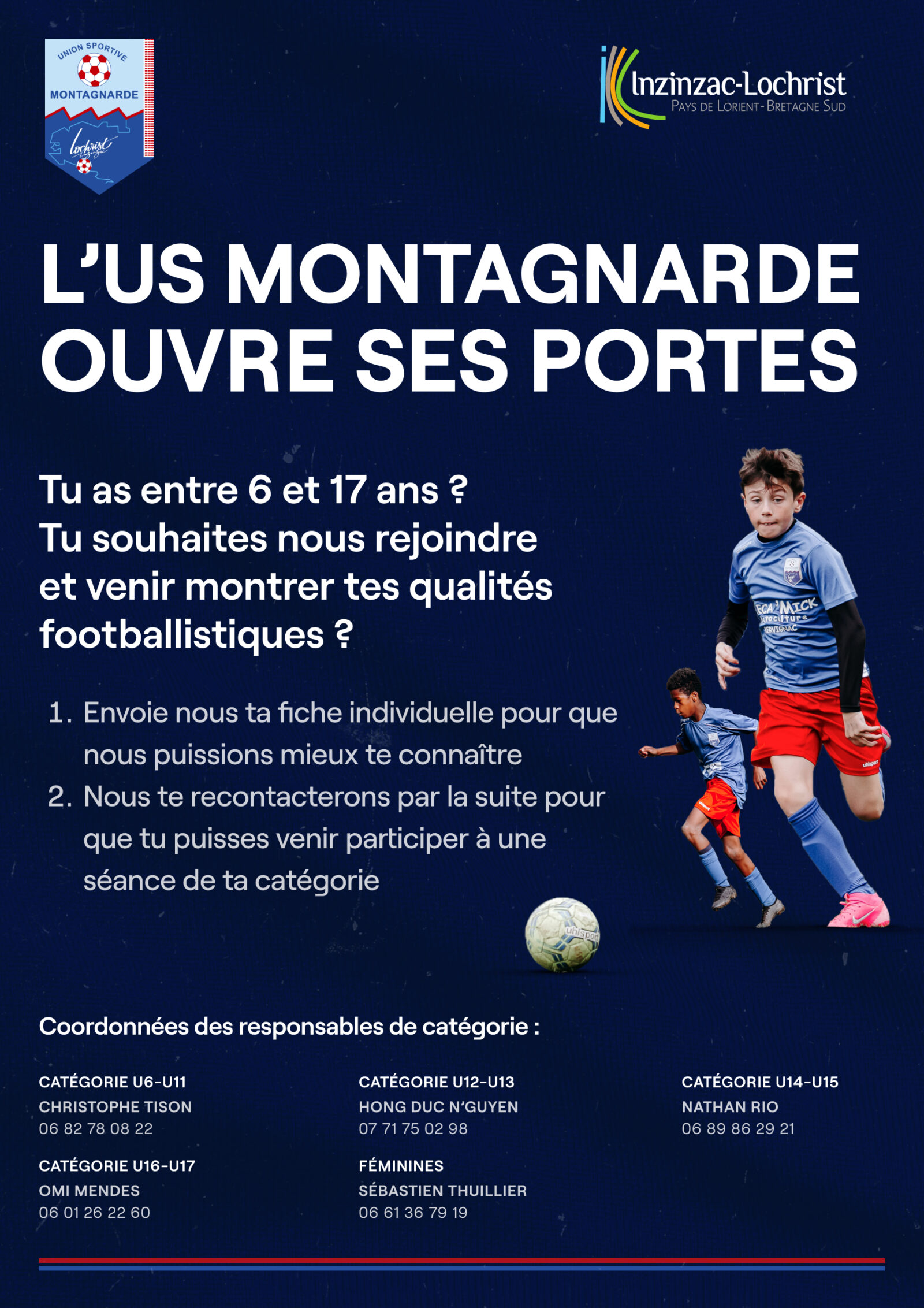 Tu as entre 6 et 17 ans ? Tu souhaites nous rejoindre et venir montrer tes qualités footballistiques ? L’US Montagnarde est à la recherche de jeunes joueurs motivés !